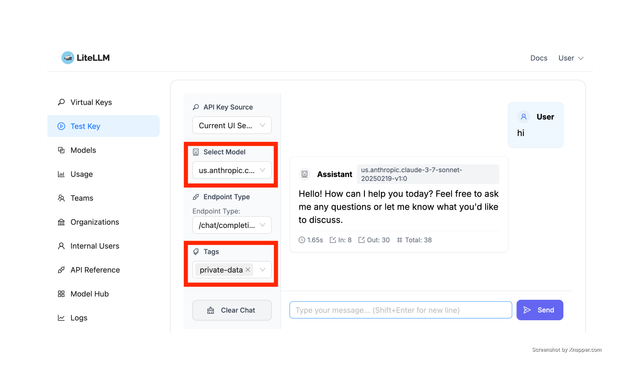 This request will succeed since we send tags=private-data and the model us.anthropic.claude-3-7-sonnet-20250219-v1:0 is in the allowed models for the private-data tag.
